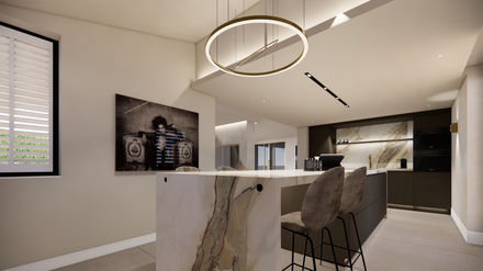 Er is een ruimte ontstaan voor een luxe keuken met keukenwand, groot kookeiland en plek voor counterstoelen.